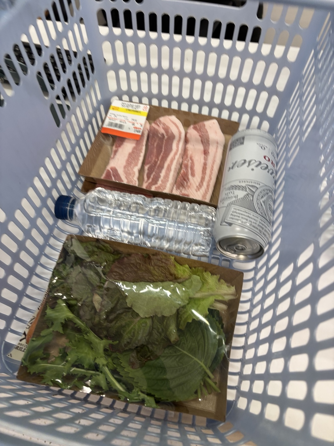삼겹살이랑 항정살, 소세지, 채소 한팩, 버드와이저 무알콜 한 캔 구매!