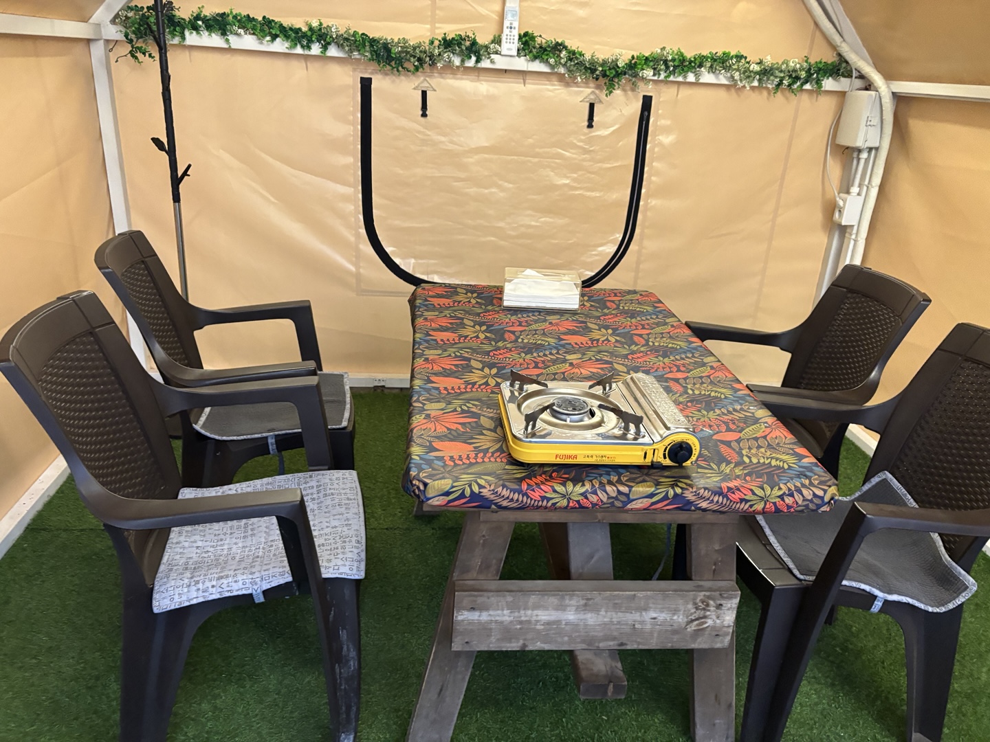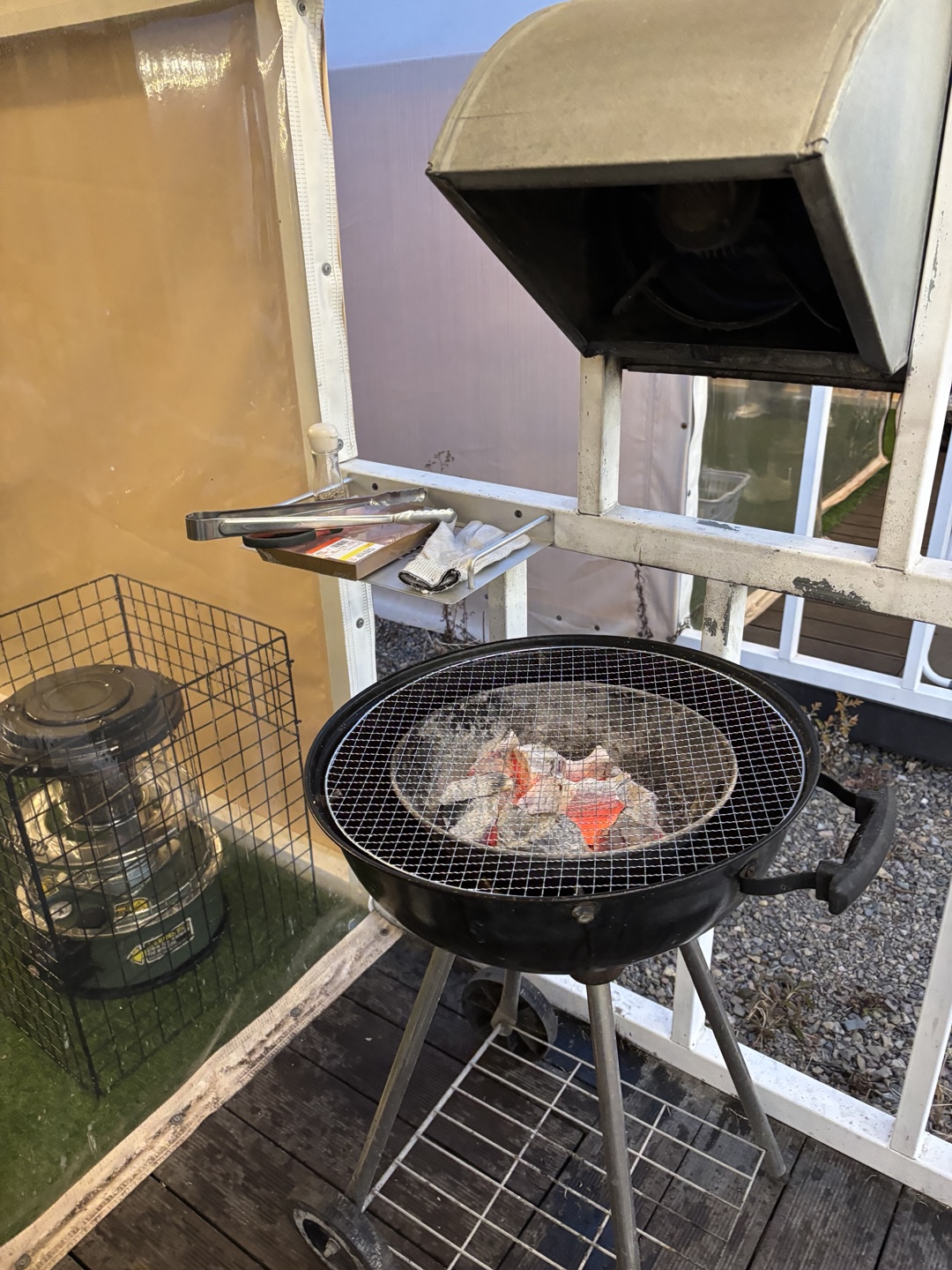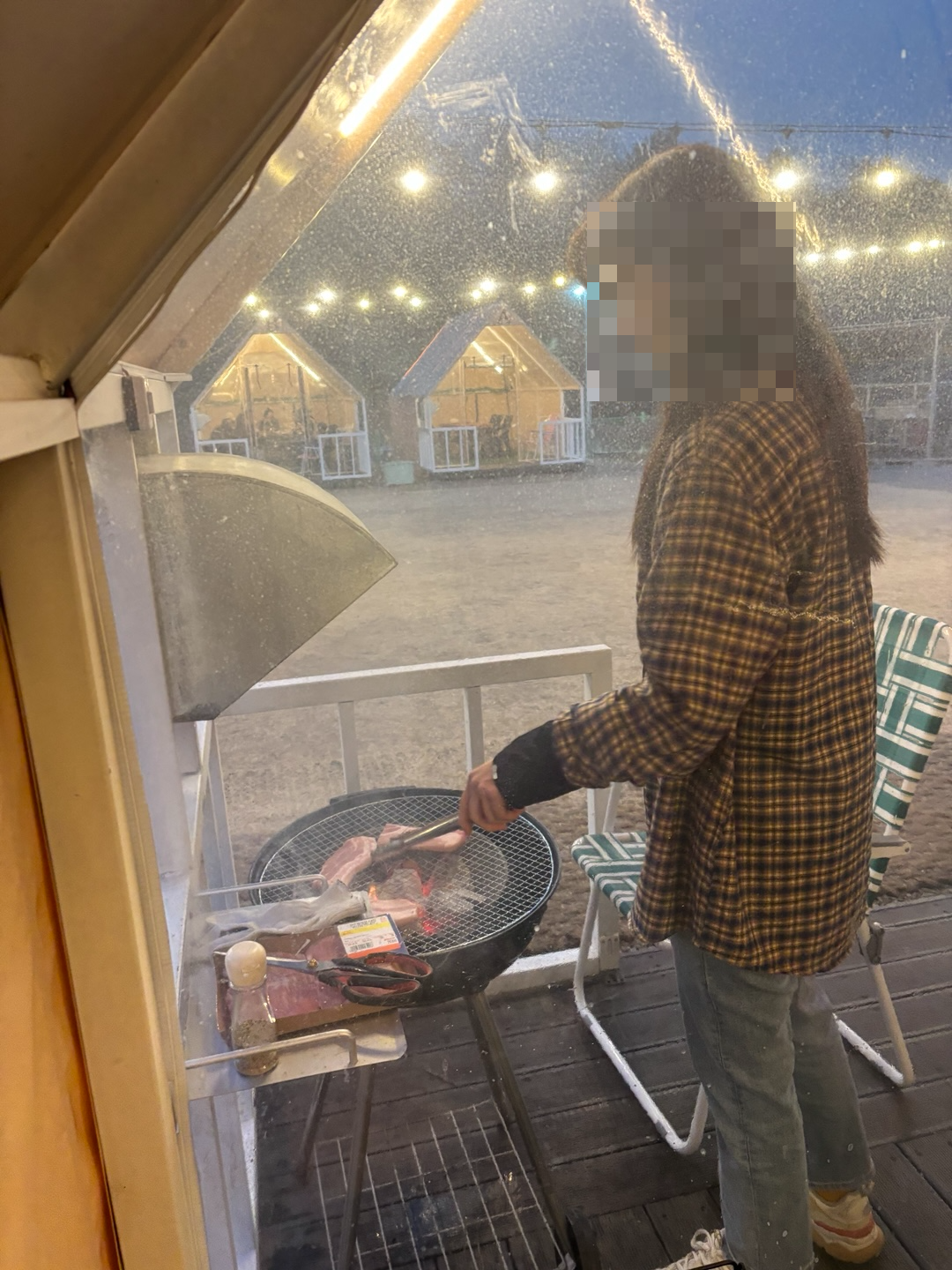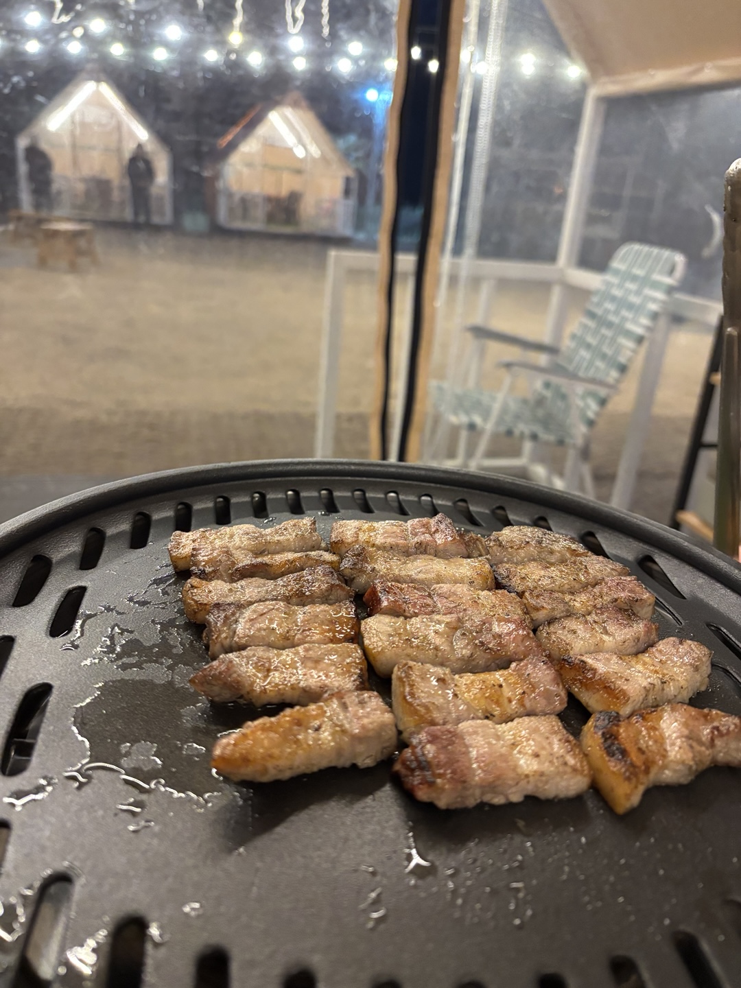 텐트 안에 버너 위에 있던 그릴에 올려주고
